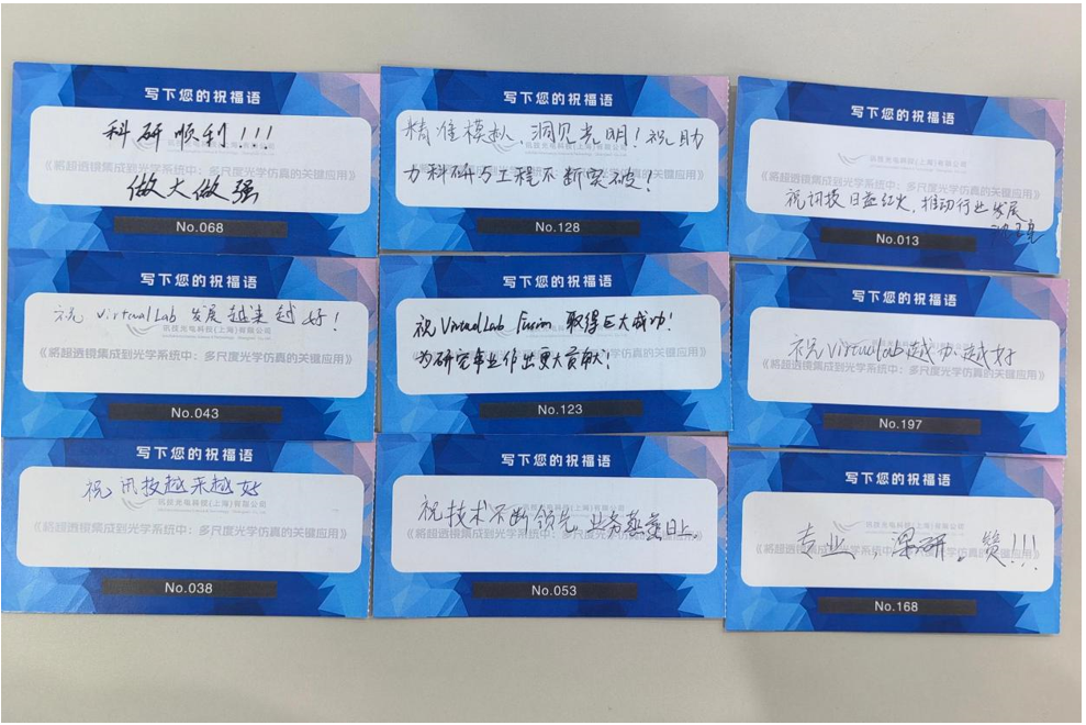 恰逢端午佳節(jié),為了讓大家在學(xué)術(shù)之余感受到節(jié)日的氛圍,訊技光電在報(bào)告現(xiàn)場(chǎng)精心組織了手寫寄語(yǔ)、抽獎(jiǎng)互動(dòng)環(huán)節(jié)。參會(huì)者們紛紛拿起筆,親手寫下對(duì)訊技光電和VirtualLab Fusion的祝福。這些寄語(yǔ)中,有對(duì)訊技光電在光學(xué)領(lǐng)域創(chuàng)新精神的贊美,有對(duì)VirtualLab Fusion軟件強(qiáng)大功能的認(rèn)可,也有對(duì)未來(lái)光學(xué)技術(shù)發(fā)展的美好期許。每一句祝福都飽含深情,體現(xiàn)了大家對(duì)訊技光電和VirtualLab Fusion的深厚情感。之后的抽獎(jiǎng)環(huán)節(jié)更是將現(xiàn)場(chǎng)的氣氛推向了高潮,幸運(yùn)的參會(huì)者們抽取到了光學(xué)書籍等精美禮品,讓大家在享受學(xué)術(shù)盛宴之余,感受到了濃濃的節(jié)日氛圍。