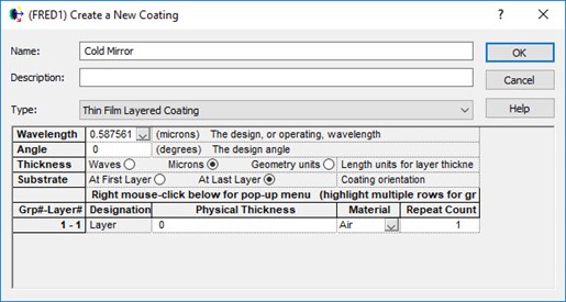 FRED中可以指定幾種膜層類(lèi)型,例如采樣膜層,薄膜膜系,四分之一波長(zhǎng)單層膜層,一般采樣膜層(入射角,波長(zhǎng)和偏振相關(guān)),偏振片/波片膜層(瓊斯矩陣) 和腳本膜層。 在此案例中,使用Thin Film Layered Coating類(lèi)型(圖1)創(chuàng)建冷鏡。