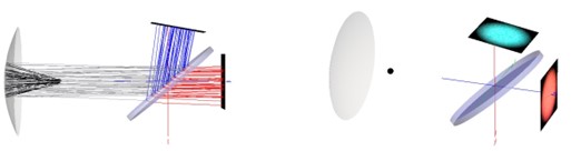 寬光譜光源對(duì)許多光學(xué)系統(tǒng)都很重要,應(yīng)用范圍包括白光照明、分光計(jì)等。FRED中的顏色圖像分析,是通過(guò)計(jì)算每個(gè)像素的色度坐標(biāo)并在表面上顯示生成的RGB值來(lái)生成顏色分布。此外,F(xiàn)RED還可以顯示彩色色度圖,并在用戶移動(dòng)光標(biāo)時(shí)指示每個(gè)像素的色度坐標(biāo)。在本案例中,將觀察兩個(gè)光學(xué)系統(tǒng)的彩色圖像。第一個(gè)系統(tǒng)包括一個(gè)分色的“冷光鏡”,將白光分為兩個(gè)波長(zhǎng)段。第二個(gè)系統(tǒng)利用線偏振器和波片來(lái)顯示雙折射材料的波長(zhǎng)依賴(lài)性。