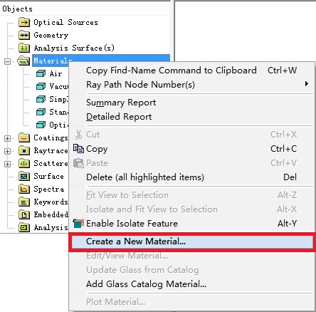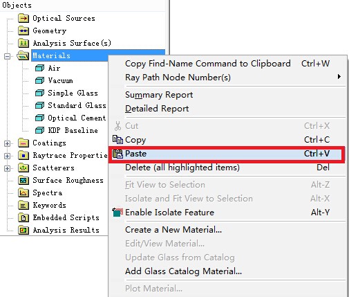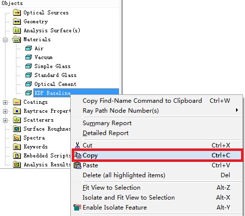 步驟2:復(fù)制KDP BaseLine到Materials樹(shù)形文件夾下,具體操作為鼠標(biāo)左鍵選中KDPBaseline,右鍵選擇Copy,并在Materilas 下選擇paste,并命名為KDP。