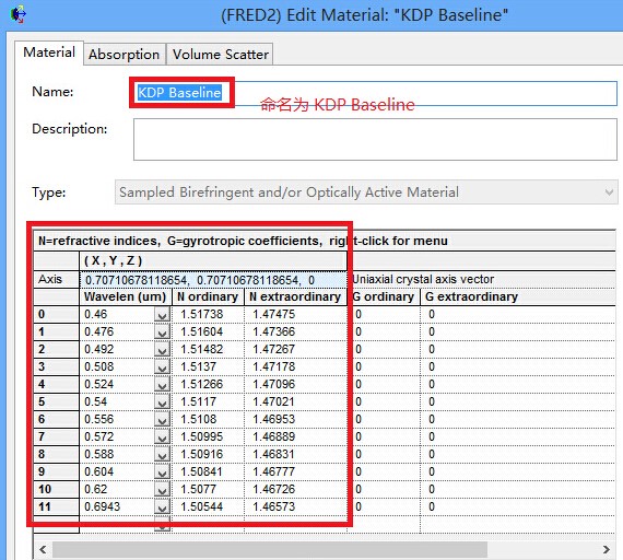 步驟1:創(chuàng)建雙折射材料KDP(磷酸二氫鉀晶體),命名為KDP Baseline。在樹(shù)形文件夾中選擇Materials>Create a New Material>Sampled Birefringent and/or Optically Active Material,按照如圖所示的數(shù)據(jù)輸入如下數(shù)值(KDP材料的創(chuàng)建方法請(qǐng)見(jiàn)本文后的備注)。