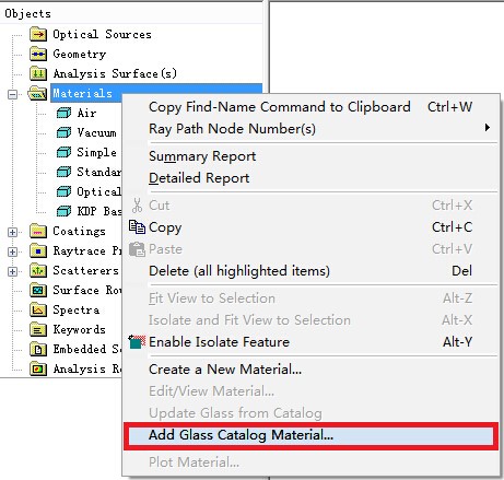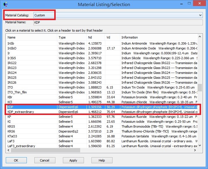 KDP材料可在材料庫(kù)中找到,在樹(shù)形文件夾Materials/ Add Glass Catalog Material… ,在類型中選擇Custom,點(diǎn)中鼠標(biāo)上下鍵移動(dòng)找到KDP(排列方式是按照第一個(gè)英文字母a-z排序)。