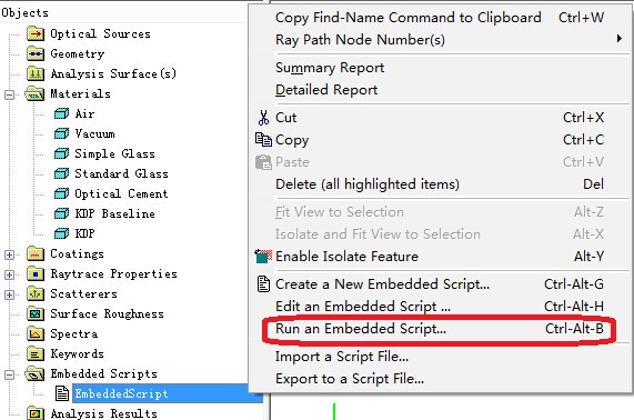 步驟4:在腳本編輯器中按下Ctrl +B運(yùn)行腳本,最后我們觀測(cè)KDP材料的折射率變化;蛲顺鼍庉嬈鳎跇(shù)形文件夾選擇Run an Embedded Scripts...