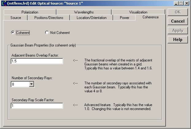 這篇文章中我們所使用的系統(tǒng)是一個(gè)簡(jiǎn)單的透鏡,將光聚集到附著在幾何面的分析面上。透鏡是一個(gè)簡(jiǎn)單的雙凸BK7單透鏡,參數(shù)為r1=60 mm, r2=-300 mm, ct=4 mm, x semi-aperture=10, y semi-aperture=10,該透鏡的像平面位于近軸焦點(diǎn)處。