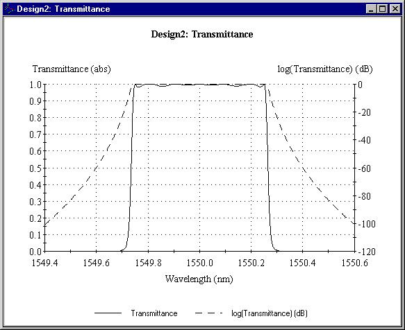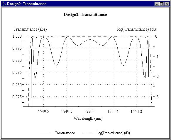 上圖顯示的是用DWDM助手、加上二層非-1/4波長匹配結(jié)構(gòu)產(chǎn)生的濾波器設(shè)計的特性曲線。下圖顯示的是通帶部分的放大圖。