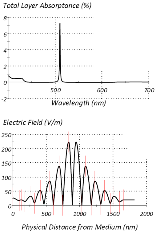 圖1.具有吸收高折射率材料和無(wú)吸收低折射率材料的窄帶濾光片的計(jì)算。由于反射率為零,吸收率和勢(shì)吸收率幾乎相同。