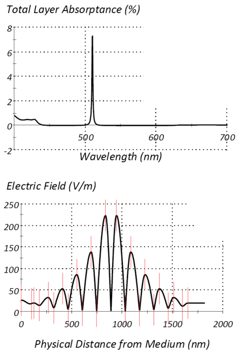 圖1顯示了使用具有無吸收低折射率材料(SiO2)和輕微吸收的高折射率材料(TiO2)薄膜的窄帶濾光片的一些結(jié)果。電場分布的平方很好地解釋了吸收率變化。勢吸收率幾乎相同,因為反射率為零,但膜層前面部分的吸收降低了分母上的Ienter的值,因此膜層后部的吸收率逐漸增加。