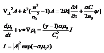 本例介紹了模擬激光在大氣中傳輸時熱暈效應(yīng)對應(yīng)的bloom命令的使用。描述熱暈的基本方程包括波動方程和流體力學(xué)方程。首先由Maxwell方程得到激光波動方程,再結(jié)合流體力學(xué)中的三個守恒定律——質(zhì)量守恒定律、動量守恒定律、能量守恒定律得到描述熱暈效應(yīng)的方程。對于理想氣體,在等壓近似下得到:
