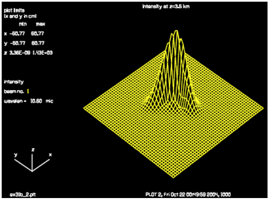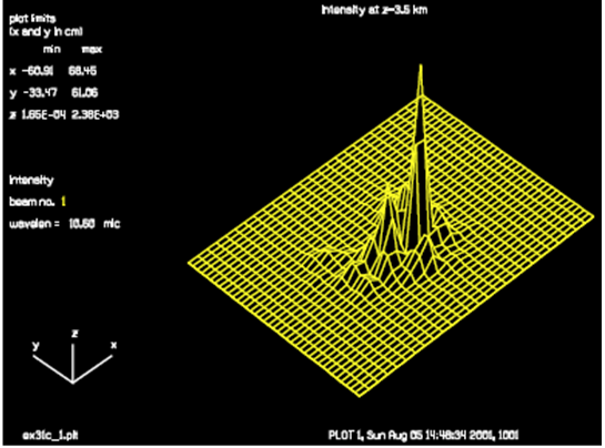 圖1.不含大氣像差和熱暈效應(yīng)的遠(yuǎn)場分布,此時光束的焦點在4km處,光斑尖銳。