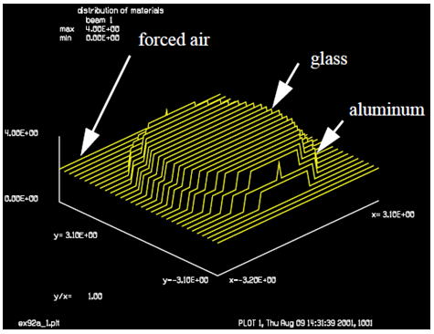 本例介紹了一個(gè)玻璃窗口被一個(gè)金屬鋁環(huán)包圍,并通過壓縮空氣對(duì)其進(jìn)行降溫。“thermal/material/add”命令可以將三種材料的熱分布整合在一個(gè)數(shù)據(jù)矩陣中。GLAD通過特定材料的名稱在MATLIB中實(shí)現(xiàn)對(duì)各種材料的調(diào)用。在每個(gè)熱區(qū)域,一共可以定義4種材料。光學(xué)材料中,虛部包含了內(nèi)部的熱源分布。流體中,虛部包含了傳導(dǎo)常數(shù)分布。