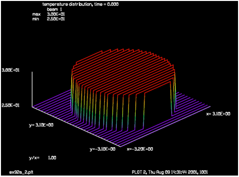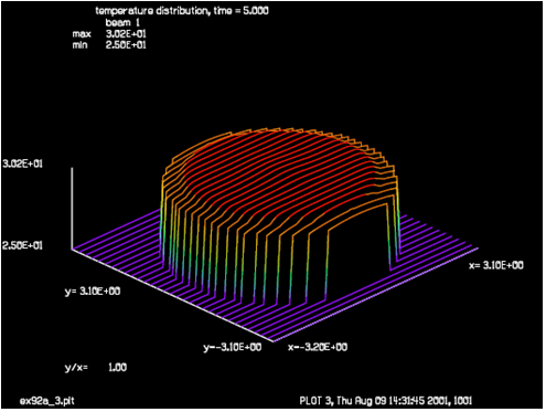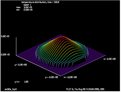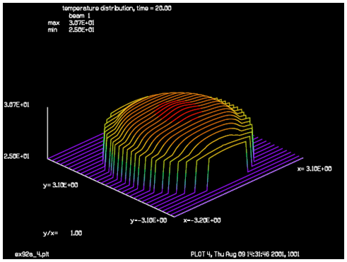 初始狀態(tài)時(shí)玻璃窗口和圓環(huán)的溫度為30度,壓縮空氣為25度,并通過“thermal/settle”命令實(shí)現(xiàn)了熱傳導(dǎo)和熱對(duì)流。壓縮空氣向內(nèi)流動(dòng)對(duì)窗口冷卻,內(nèi)部熱源在窗口的中心位置開始發(fā)出熱量。對(duì)于相距0.1cm的兩個(gè)陣列點(diǎn),材料的熱時(shí)間常數(shù)分別為:玻璃,2秒;鋁,0.0043秒;壓縮空氣,12.2秒。鋁的熱導(dǎo)率非常高,熱量不斷地向空氣中擴(kuò)散。在5秒時(shí),內(nèi)部熱源的影響幾乎觀察不到,但是在20秒時(shí)已經(jīng)非常的明顯了。當(dāng)時(shí)間達(dá)到150秒時(shí)內(nèi)部熱源的加熱與壓縮空氣的冷卻達(dá)到了一個(gè)穩(wěn)定平衡的狀態(tài)。