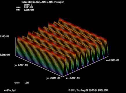 通過將干涉圖樣轉(zhuǎn)換為相位屏,GLAD能夠模擬體全息光柵。在本例中,兩束具有一定夾角的準直光束形成了干涉圖樣。該干涉圖樣對應(yīng)的強度分布被轉(zhuǎn)化為相位調(diào)制分布。從而用于模擬全息記錄介質(zhì)中形成的梯度折射率分布。體全息結(jié)構(gòu)一旦形成,就可以在傳輸過程中將一束入射光波逐漸轉(zhuǎn)換成形成體全息結(jié)構(gòu)的另一束光波。兩束光波之間的能量傳遞轉(zhuǎn)換效率與體全息結(jié)構(gòu)的厚度密切相關(guān)。若厚度很薄,則入射光波轉(zhuǎn)化為另一束的效率很低,隨著厚度逐漸增加,轉(zhuǎn)換效率也隨之增加。到某一厚度時轉(zhuǎn)換效率最大,入射光束完全轉(zhuǎn)換為另一束。但是隨著厚度的進一步增加,能量又會轉(zhuǎn)換回到入射光束。