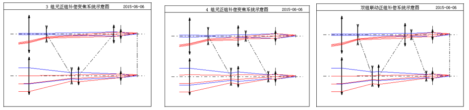 軸向位移型斷續(xù)變焦系統(tǒng)也可以是三組元結(jié)構(gòu)、四組元結(jié)構(gòu)等多種形式。設(shè)計時都是借用機械補償式連續(xù)變焦系統(tǒng)設(shè)計方法設(shè)計。只是對連續(xù)變焦系統(tǒng)運動形式的簡化。