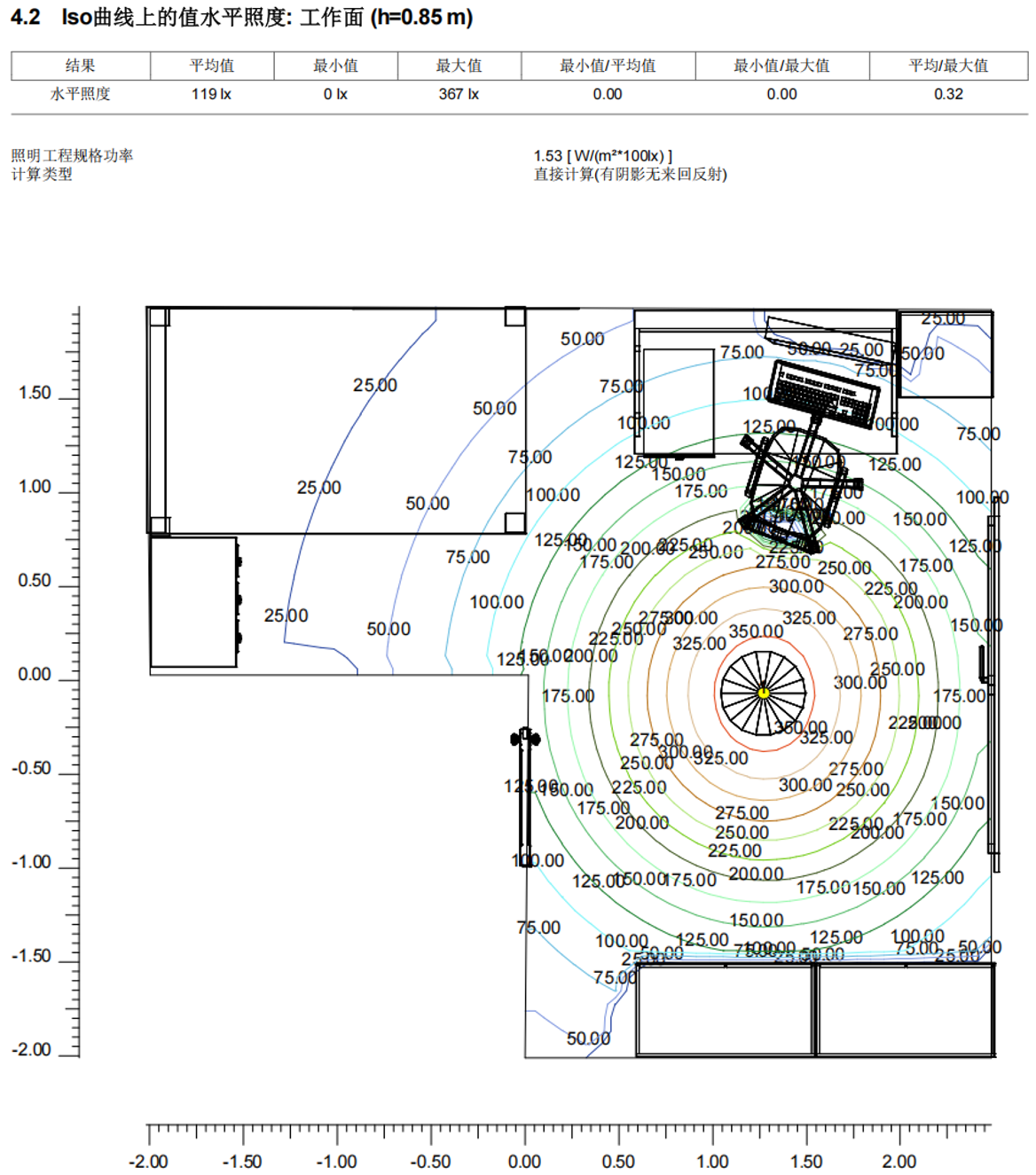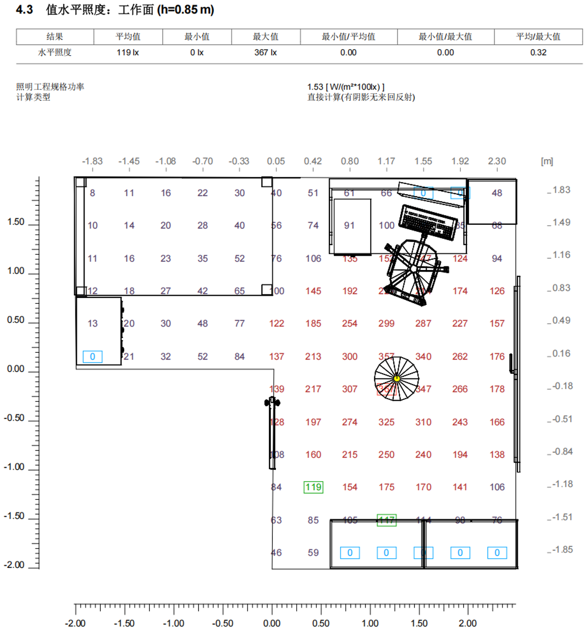 數(shù)值圖顯示區(qū)域照度為120-390lx。