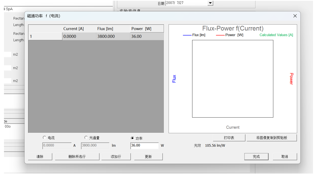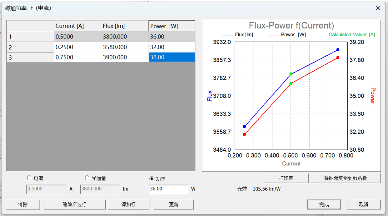 將功率改為34W后,點擊更新,可以查看在此條件下的光通量和電流,點擊完成,保存為OXL文件(保存其它文件格式時,只能保留一組數(shù)據(jù)),保存后,再次導(dǎo)入時可以看到完整的數(shù)據(jù)