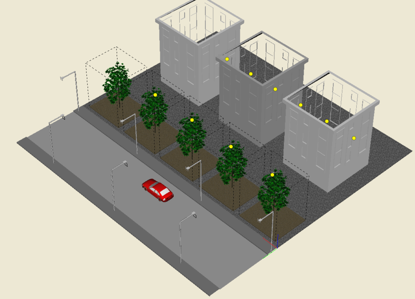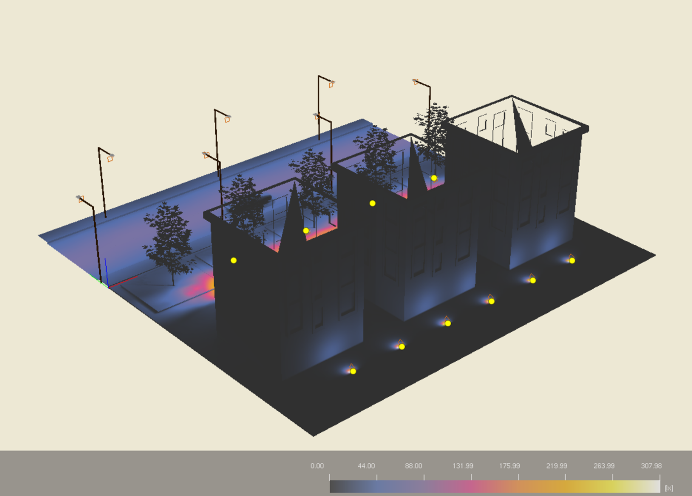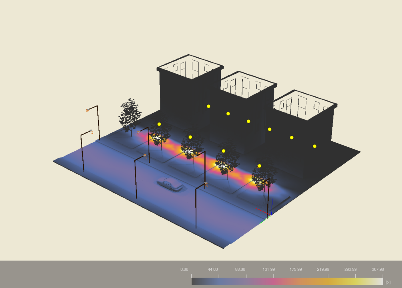 該渲染圖呈現(xiàn)了一個光線分布均衡、燈具擺放合理的建筑街道場景,增強了場景的真實感。