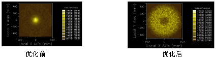 左圖是一個(gè)弧光燈的光線追跡效果,其反射罩面型為拋物線型。反射罩面型定義完成后,可以針對所需的度量量設(shè)置變量、評價(jià)函數(shù)、優(yōu)化方法等,對反射罩的面型、位置等參數(shù)進(jìn)行優(yōu)化。下圖所示的是優(yōu)化前后探測面的照度分布。