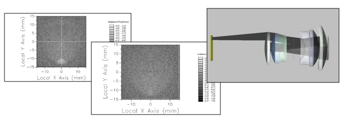 FRED可以很容易的使用圖形用戶界面及內(nèi)置的腳本語言實(shí)現(xiàn)熱輻射和熱成像,利用輻射測量技術(shù),可以在很短的時(shí)間內(nèi)準(zhǔn)確的執(zhí)行熱成像、冷反射、熱照度均勻性、自發(fā)熱輻射。如上圖所示是一個(gè)熱茶壺不同的輻射系數(shù)及不同的表面溫度分布透過單透鏡成像在探測器上的2D照度圖。