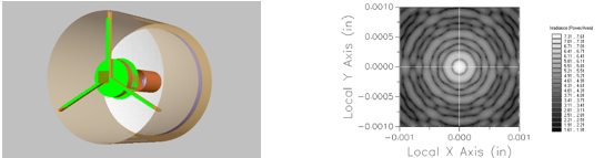 FRED能夠模擬計(jì)算孔徑、擋板和葉片等產(chǎn)生的衍射效應(yīng)和對光機(jī)系統(tǒng)的影響,使得對于光機(jī)系統(tǒng)的模擬更接近現(xiàn)實(shí)。下圖是Cassegrain 望遠(yuǎn)鏡的第二主鏡和支持結(jié)構(gòu)等形成的衍射效應(yīng)的分析