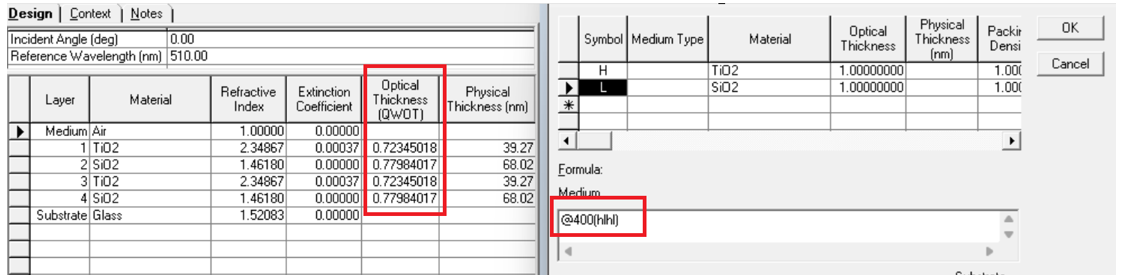 4. 公式工具(Formula)現(xiàn)在具備為膜層使用不同參考波長的功能。用 @符號引入波長,其后必須跟一對括號。括號內的所有符號都會用該波長來確定膜層厚度,而非設計中的參考波長;括號外的符號則使用設計的參考波長。例如: