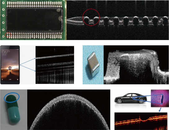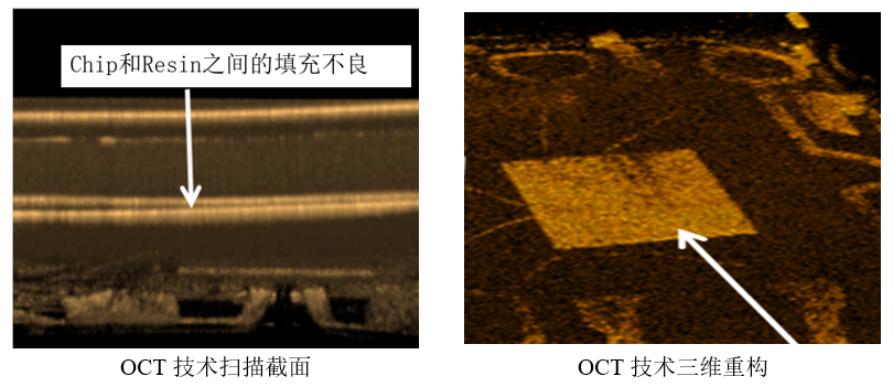 在芯片封裝中往往會有可能出現(xiàn)Resin的填充不良問題,其樹脂或者陶瓷填充材料可以被OCT技術(shù)透穿進行光學(xué)檢測