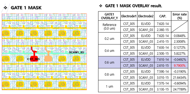 可以將結構參數(shù)設置為變量,執(zhí)行高級工藝余量分析,如圖顯示了根據(jù)柵極掩膜的覆蓋率的電容結果,通過使用split選項,工程師可以通過門極掩膜的未對準來預測錯誤率。