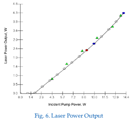 連續(xù)波運(yùn)轉(zhuǎn)的激光可以直接分析。它可以計(jì)算基模光的輸出功率以及近似得到多模運(yùn)轉(zhuǎn)時(shí)的輸出功率。通過(guò)對(duì)整個(gè)晶體進(jìn)行迭代積分,可以得到與時(shí)間無(wú)關(guān)的三維激光速率方程的解。圖6是一個(gè)端面泵浦Nd3+:YAG棒的例子。圓圈表示模擬結(jié)果,綠色三角是測(cè)量結(jié)果。具體過(guò)程參見(jiàn)“結(jié)果驗(yàn)證”的段落。