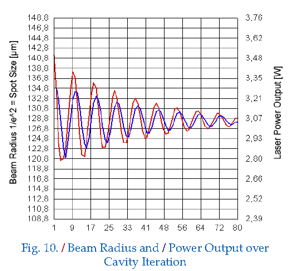 在計(jì)算的過(guò)程中有兩個(gè)圖形窗口是打開(kāi)的,一個(gè)給出了隨著迭代次數(shù)的增加,輸出鏡上的光強(qiáng)分布,如圖9所示。另一個(gè)窗口顯示了隨著諧振腔內(nèi)迭代的進(jìn)行,光斑的尺寸收斂過(guò)程以及同步計(jì)算的輸出功率,如圖10所示。另外,還可以打開(kāi)一個(gè)顯示光束質(zhì)量的窗口。