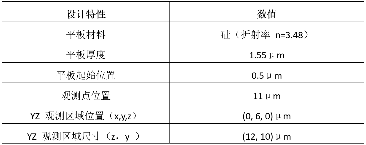 第一種設(shè)計(jì)為介質(zhì)(硅)平板。該示例將展示無場(chǎng)聚焦的情況,并作為兩種透鏡設(shè)計(jì)的參考基準(zhǔn)。該平板也是后續(xù)兩種設(shè)計(jì)的基礎(chǔ),后兩種設(shè)計(jì)均通過在平板上蝕刻制成。