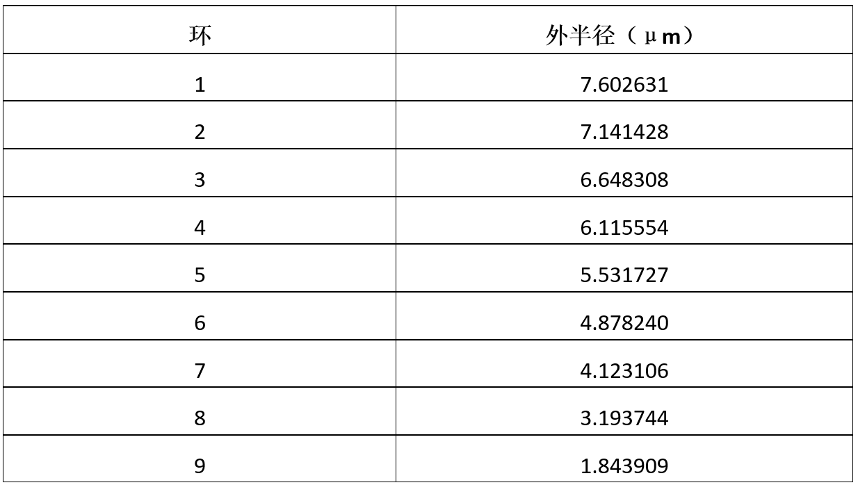 第一種透鏡示例為厚菲涅耳透鏡,其厚度與介質(zhì)平板一致(1.05μm)。每個(gè)環(huán)的起始半徑通過公式解析計(jì)算得出,如表 5 所示。利用這些半徑制作一系列尺寸逐漸減小的光纖波導(dǎo),材料在硅和空氣之間交替分配,中心區(qū)域?yàn)榭諝狻9饫w波導(dǎo)通過 OptiFDTD 中的 VBScripting 腳本制作。