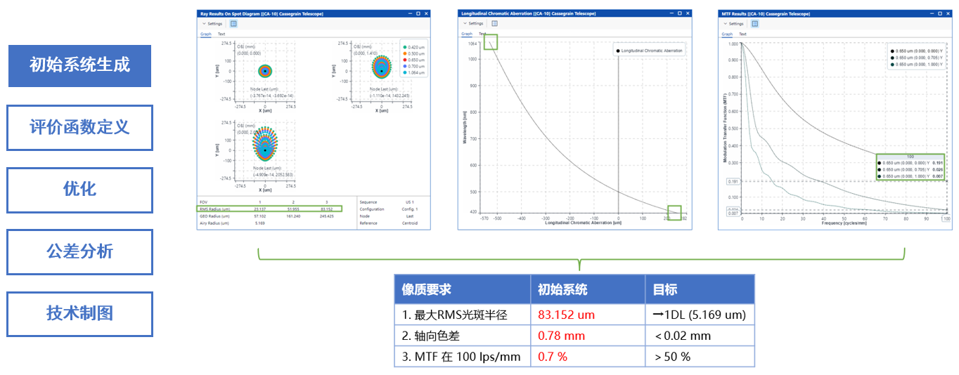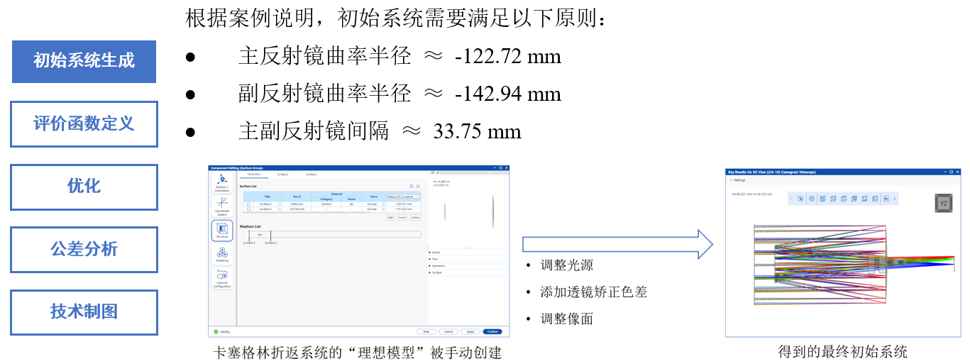 卡塞格林望望遠(yuǎn)鏡廣泛應(yīng)用于天文觀測(cè),卡塞格林望遠(yuǎn)鏡廣泛應(yīng)用于天文觀測(cè)、空間成像和激光測(cè)距等領(lǐng)域,憑借其折疊光路設(shè)計(jì),實(shí)現(xiàn)了長(zhǎng)焦距與緊湊結(jié)構(gòu)的結(jié)合,具有口徑大、像差校正能力強(qiáng)和易于安裝探測(cè)器等優(yōu)點(diǎn)。在本案例中,將通過(guò)設(shè)計(jì)一個(gè)典型的折返式卡塞格林望遠(yuǎn)鏡光學(xué)系統(tǒng),演示在 VLU 中的光學(xué)設(shè)計(jì)流程,包括初始結(jié)構(gòu)建立、像差分析、評(píng)價(jià)函數(shù)定義、優(yōu)化。