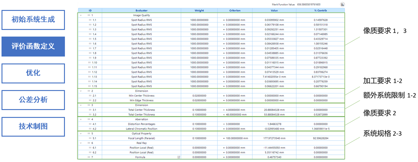 根據(jù)系統(tǒng)規(guī)格、額外系統(tǒng)限制以及像質(zhì)與加工要求,定義了各種與之對(duì)應(yīng)的評(píng)價(jià)函數(shù)。
