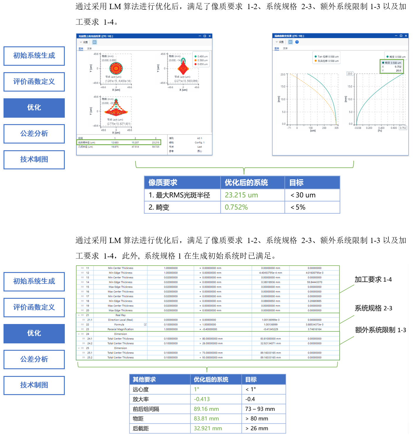 設計結果如下,像質,系統(tǒng)規(guī)格、額外系統(tǒng)限制以及加工要求均滿足預期設計目標。