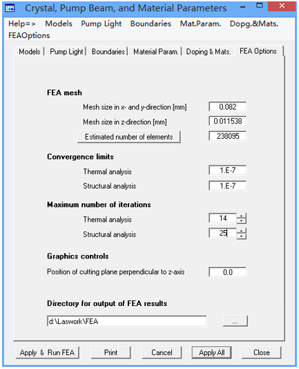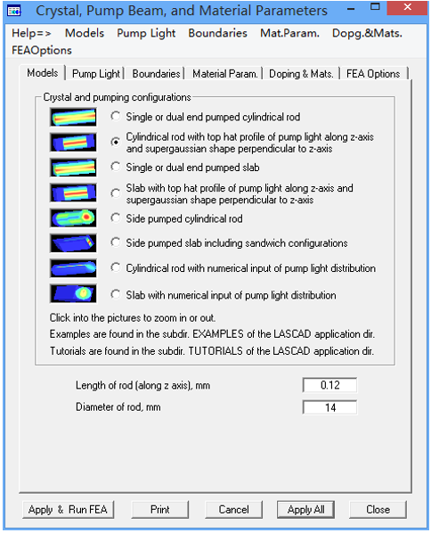 選擇主菜單“FEA-Parameter Input & FEA code”,打開“Crystal ,Pump Beam and Material Parameters ”窗口,該窗口有6個標(biāo)簽。“Models”標(biāo)簽顯示了LASCAD提供的預(yù)定義模式,如圖1所示。在這個教程中,模式Cylindrical rod with top hat 已經(jīng)被勾選,該模式表示吸收泵浦光強分布在熱透鏡軸方向為近似平頂(也稱為常數(shù))分布。