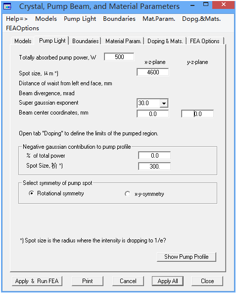 選擇’Pump Light’標(biāo)簽,如圖2所示,該標(biāo)簽用于定義泵浦功率密度。在這個模式下,我們必須事先知道總的吸收泵浦功率?偟奈展β蕿500W。垂直于薄片軸的泵浦功率用超高斯函數(shù)定義,如help=>Pump Light-Top Hat Pump Light Distribution in Axis Direction。光斑的大小等于分布半徑。超高斯指數(shù)增大到一定程度后,截面分布接近平頂分布。可以點擊“Show Pump Profile”來查看截面圖。我們甚至可以從這個截面圖中減去一定百分比被吸收的泵浦光功率。