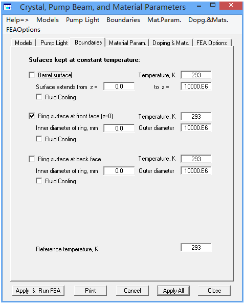 如圖所示,選擇“Boundaries”來定義邊界條件。假設(shè)在(z=0)處的晶體面與固體接觸時為常溫,當(dāng)然我們也可以勾選流體冷卻。假設(shè)固體溫度為293K。在3能級系統(tǒng)中,我們一般都采用開氏溫度。參考溫度是用來計算晶體熱畸變,對應(yīng)于晶體的初始溫度。
