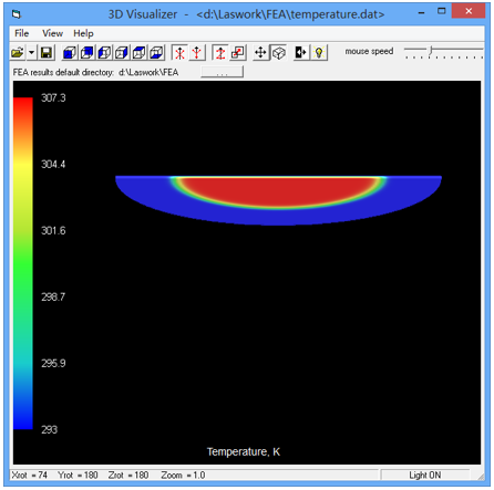 FEA計算完成之后,點擊LASCAD 主菜單中“FEA-3D Visualizer” ,顯示熱負(fù)載分布,溫度分布,變形和壓力結(jié)果。圖5顯示了未冷卻處理的腔端面處的溫度分布。