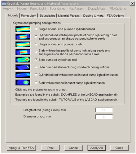 通過標(biāo)簽“Models”下面的列表可以選擇不同的晶體和泵浦結(jié)構(gòu),我們選擇“Side pumped cylindrical rod”。