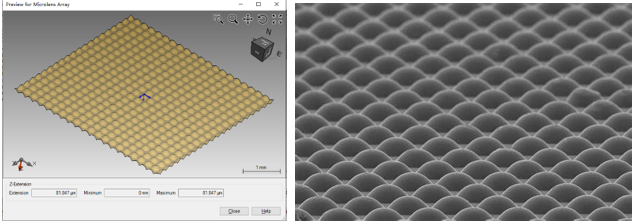 左圖:VirtualLab Fusion設(shè)計的微透鏡陣列 右圖:加工的微透鏡陣列結(jié)構(gòu)