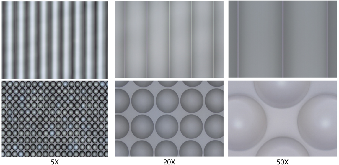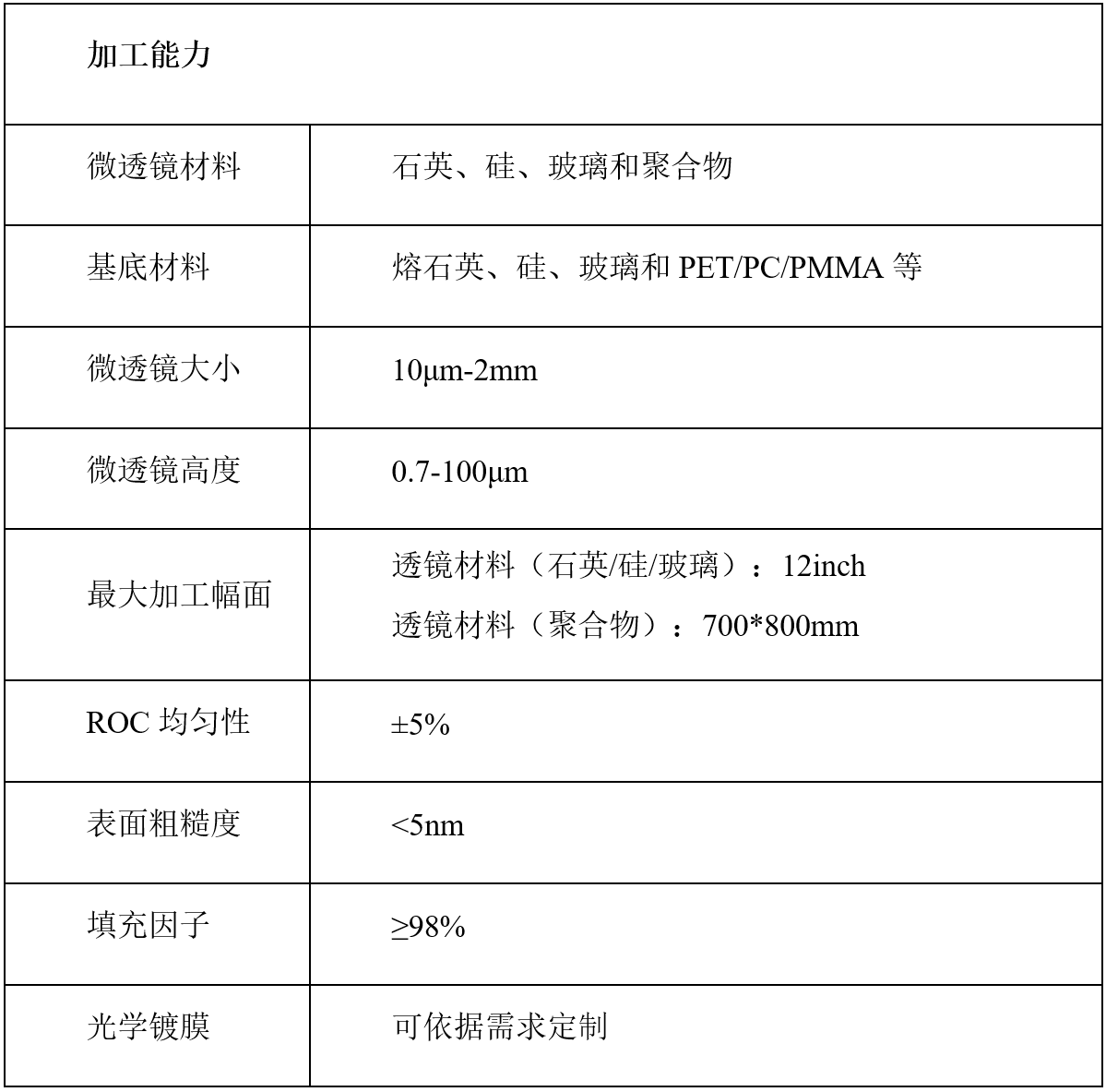 目前,我們采用納米壓印技術(shù)加工微透鏡陣列,可以在玻璃、PET/PC、硅、金屬或集成電路晶圓等各種材料或器件表面制作微透鏡陣列。微透鏡的材質(zhì)是高透光率、耐高溫的聚合物,如環(huán)氧樹脂或丙烯酸酯。