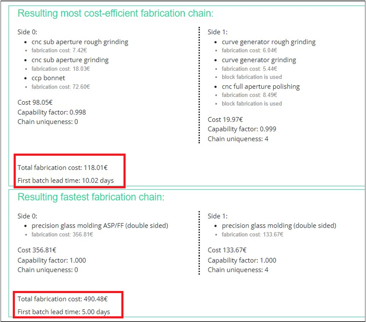 PanDao可以讀取ISO10110標(biāo)準(zhǔn)中描述的鏡頭參數(shù)和公差并考慮到360多種光學(xué)制造技術(shù),以最低的成本,生成最優(yōu)的制造鏈。因此,PanDao可以用于設(shè)計階段的成本影響分析,也可以用于優(yōu)化供應(yīng)鏈管理,例如確定最優(yōu)供應(yīng)商。