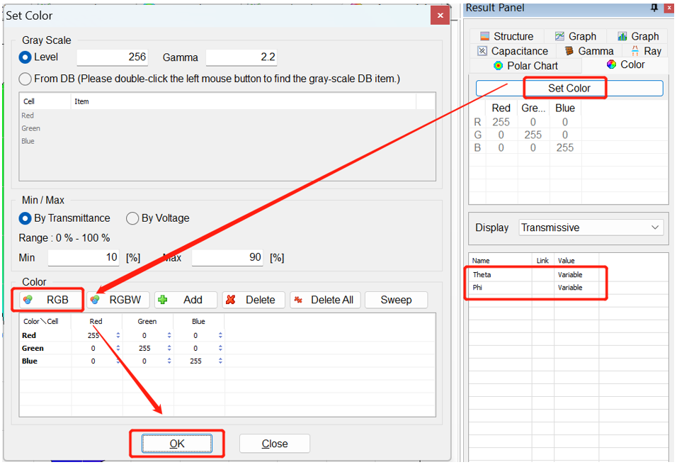 TechWiz LCD 2D可以分析液晶盒的顏色和彩膜(Color-Filter,CF)的特性。對(duì)于RGB三組結(jié)構(gòu)相同的彩膜結(jié)構(gòu),可以使用CF層組來搭建,對(duì)于RGB三組結(jié)構(gòu)不同的彩膜結(jié)構(gòu),可以使用單層+多疇層組的方式來進(jìn)行仿真。