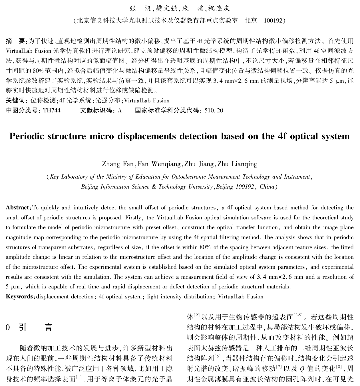 摘要:為了快速、直觀地檢測出周期性結構的微小偏移,提出了基于4f光學系統(tǒng)的周期性結構微小偏移檢測方法。 首先使用VirtualLab Fusion 光學仿真軟件進行理論研究,建立預設偏移的周期性微結構模型,構造了光學傳遞函數(shù),利用4f空間濾波方法,獲得與周期性微結構對應的像面幅值圖。 經(jīng)分析得出在透明基底的周期性結構中,不論尺寸大小,若偏移量在相鄰特征尺寸間距的80%范圍內,經(jīng)擬合后幅值變化與微結構偏移量呈線性關系,且幅值變化位置與微結構偏移位置一致。 依據(jù)仿真的光學系統(tǒng)參數(shù)搭建了實驗系統(tǒng),實驗結果與仿真一致,并且該套系統(tǒng)可以實現(xiàn)3.4mm×2.6mm的測量視場,分辨率能達5 μm,能夠實時快速地對周期性結構材料進行位移或缺陷檢測。