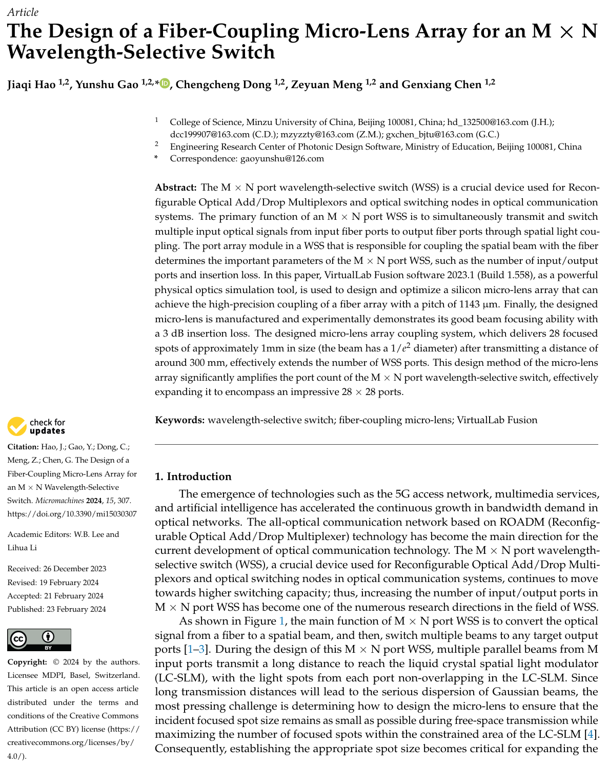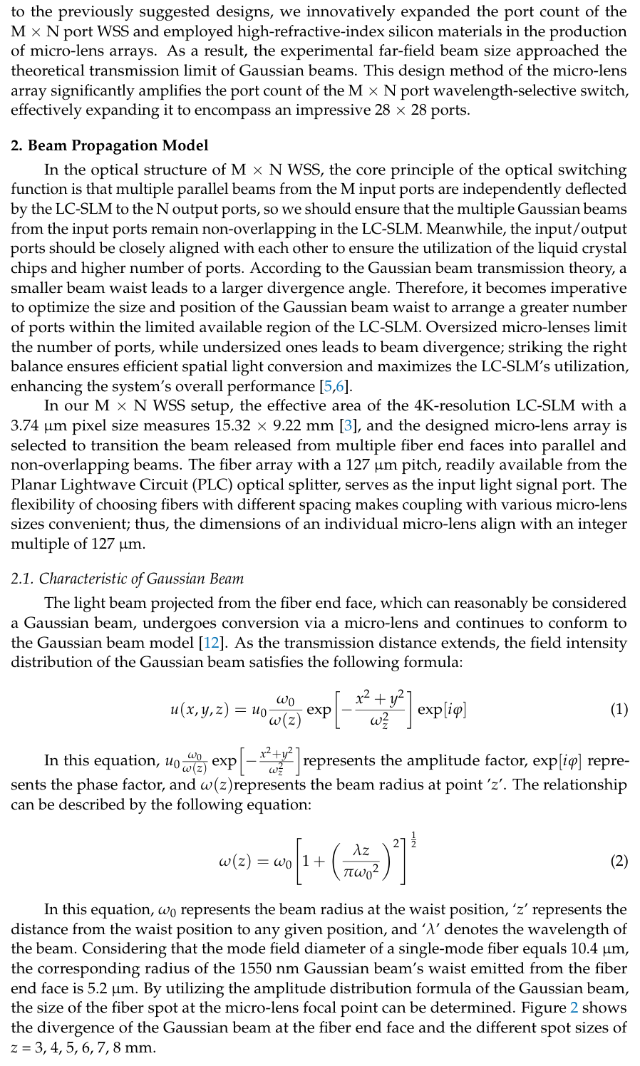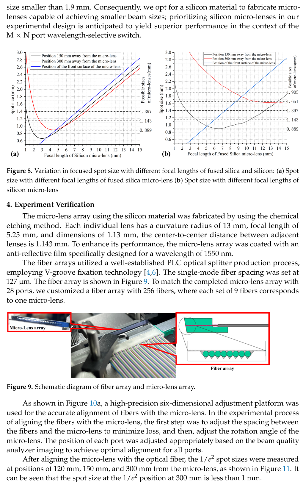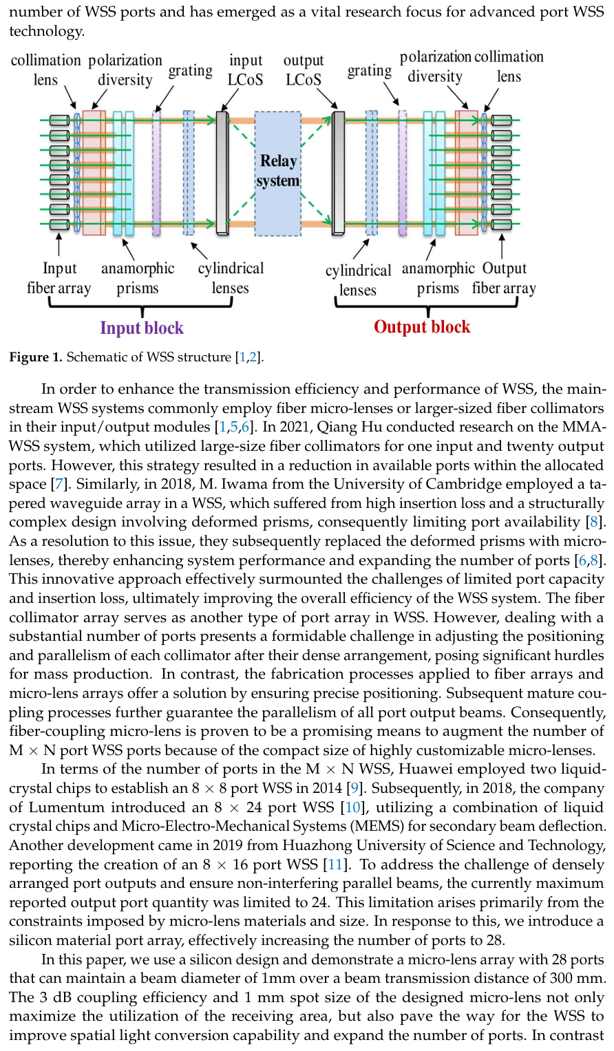 摘要:M×N端口波長選擇開關(guān)(WSS)是光通信系統(tǒng)中可重構(gòu)光分插復(fù)用器和光交換節(jié)點(diǎn)的重要器件。其主要功能是通過空間光耦合技術(shù),將多個(gè)輸入光信號同時(shí)傳輸并切換至輸出光纖端口。WSS中負(fù)責(zé)將空間光束與光纖耦合的端口陣列模塊,決定了M×N端口WSS的關(guān)鍵參數(shù),如輸入/輸出端口數(shù)量和插入損耗。本文采用強(qiáng)大的物理光學(xué)仿真工具VirtualLab Fusion 2023.1(Build 1.558)軟件,設(shè)計(jì)優(yōu)化了硅基微透鏡陣列,實(shí)現(xiàn)1143 μm間距光纖陣列的高精度耦合。最終,所設(shè)計(jì)的微透鏡經(jīng)制造驗(yàn)證,在3 dB插入損耗條件下展現(xiàn)出優(yōu)異的聚焦能力。該微透鏡陣列耦合系統(tǒng)在傳輸約300 mm距離后,可生成28個(gè)直徑約1mm(光束1/e²直徑)的聚焦光斑,顯著擴(kuò)展了波長選擇開關(guān)的端口數(shù)量。該微透鏡陣列設(shè)計(jì)方法顯著提升了M×N端口波長選擇開關(guān)的端口數(shù)量,成功擴(kuò)展至令人矚目的28×28端口規(guī)模。