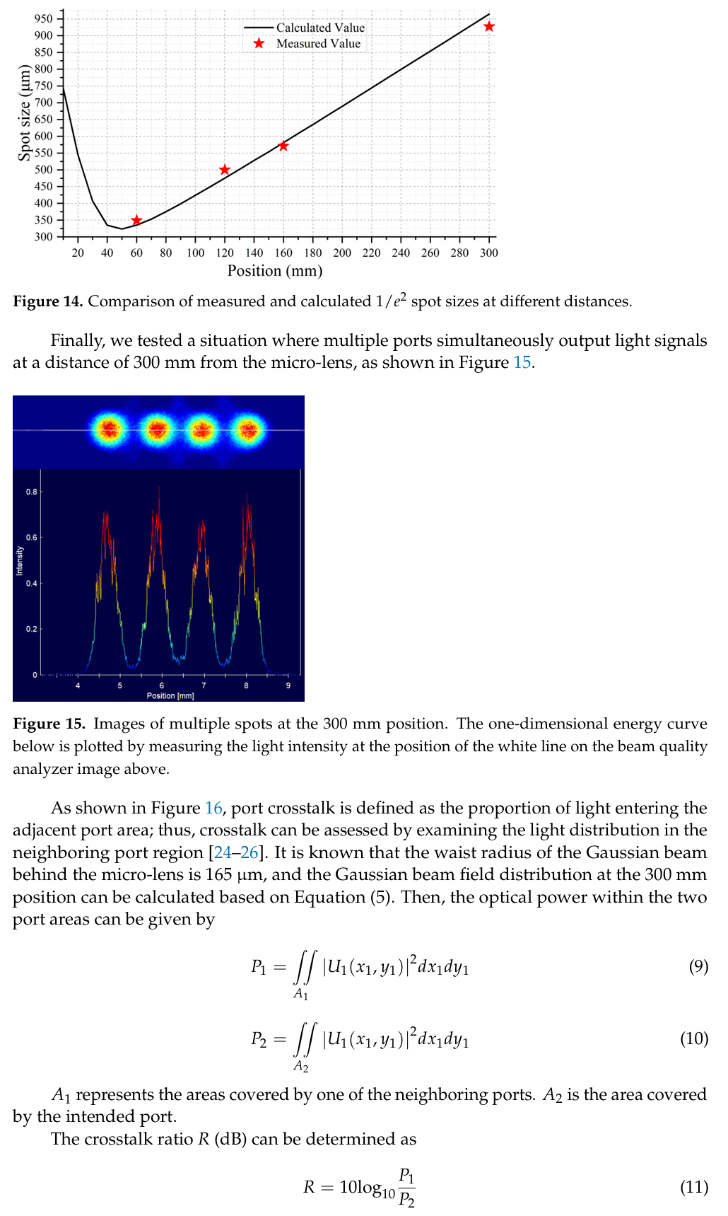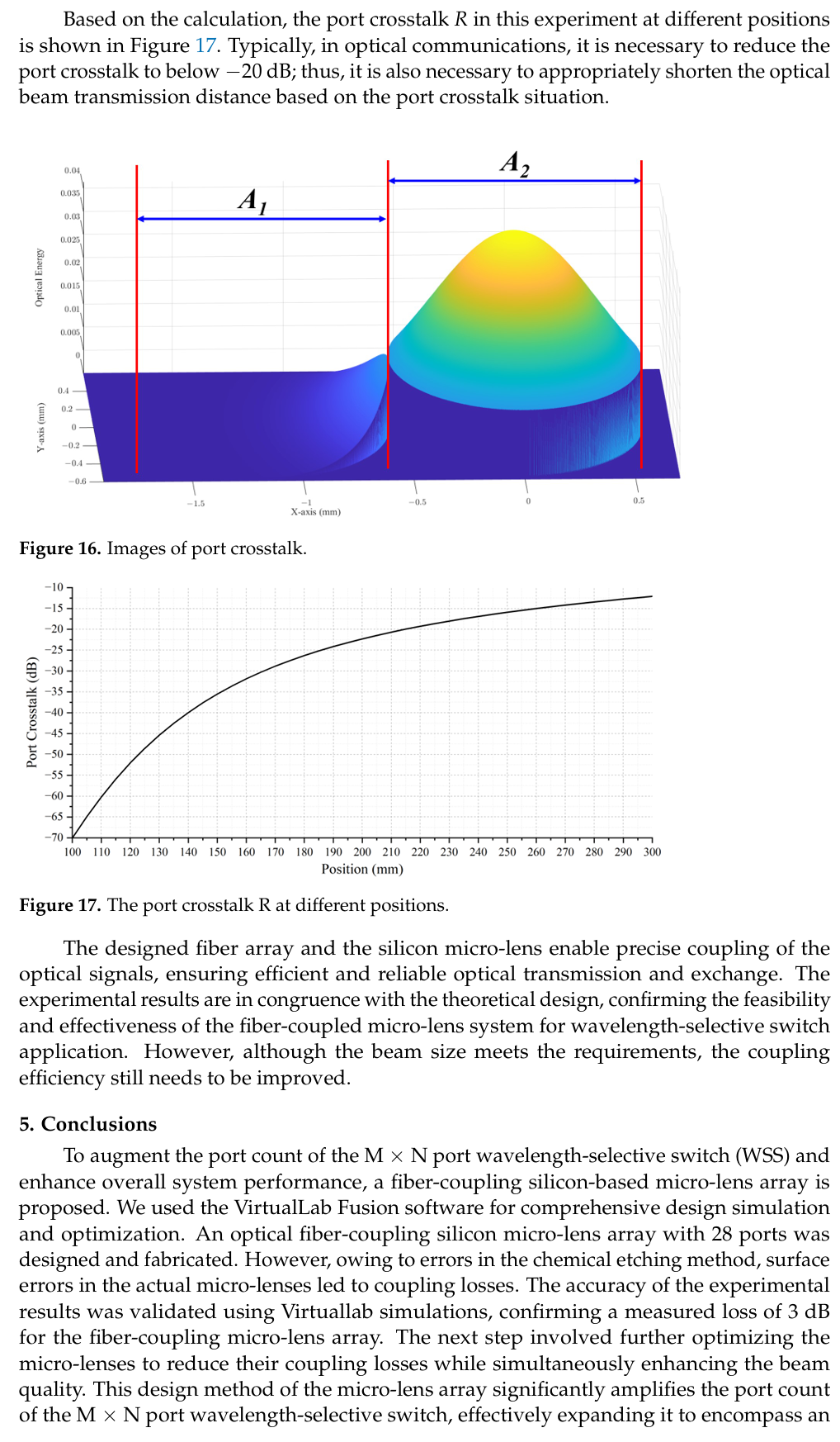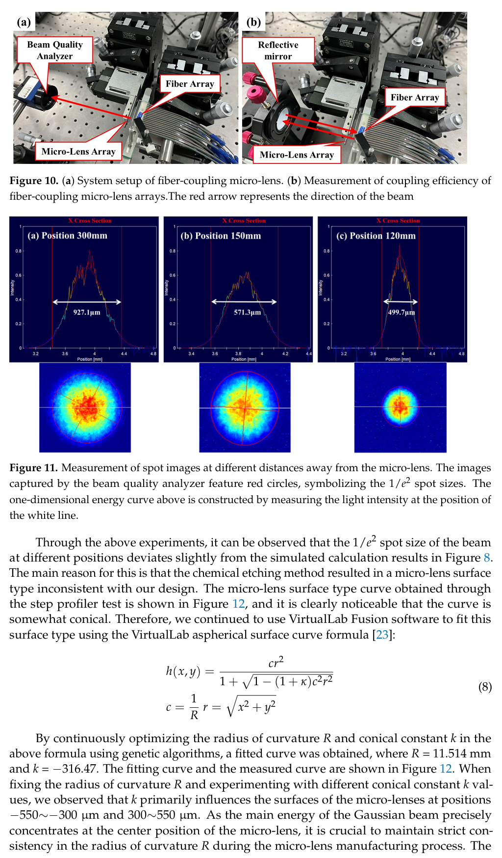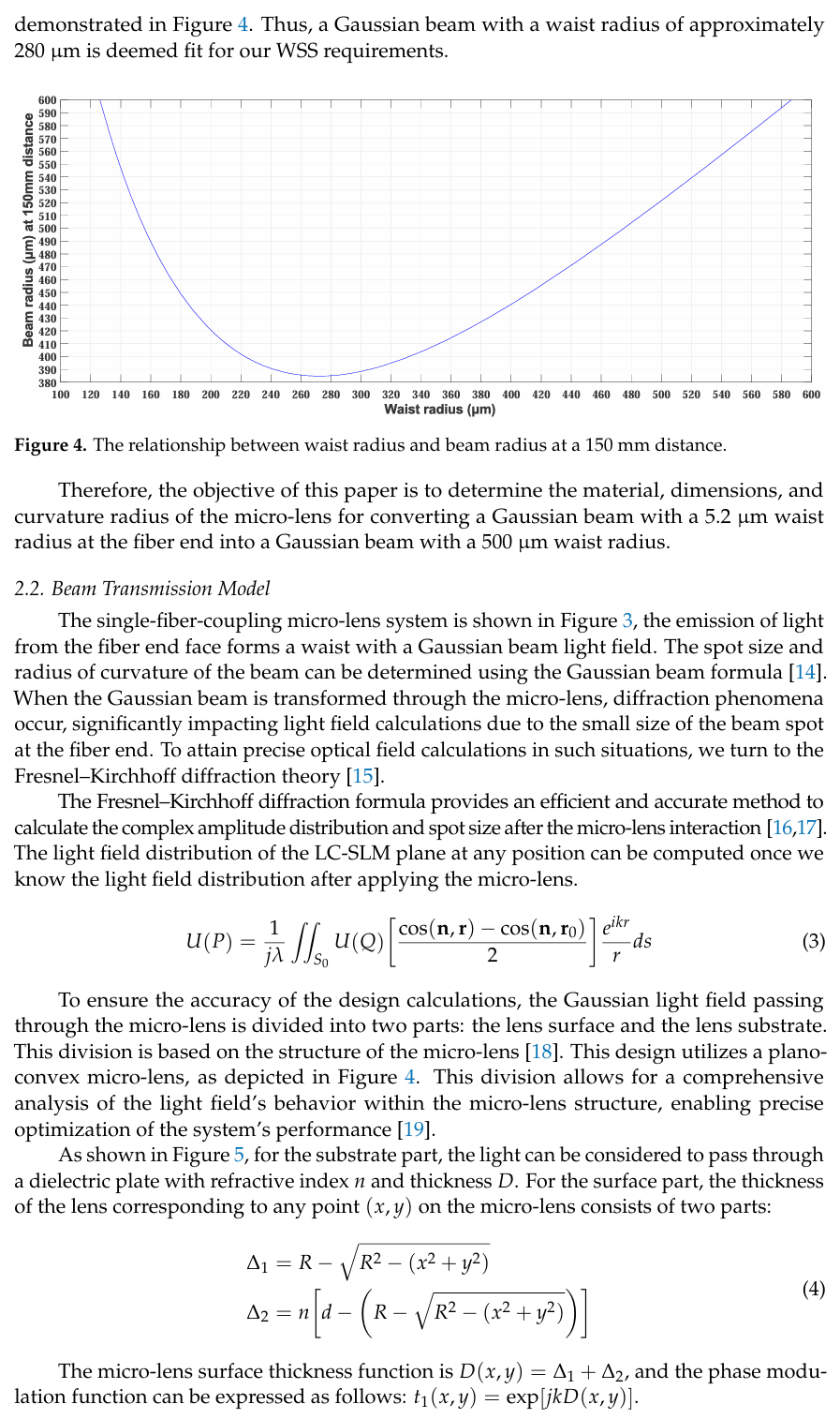 摘要:M×N端口波長選擇開關(guān)(WSS)是光通信系統(tǒng)中可重構(gòu)光分插復(fù)用器和光交換節(jié)點(diǎn)的重要器件。其主要功能是通過空間光耦合技術(shù),將多個(gè)輸入光信號同時(shí)傳輸并切換至輸出光纖端口。WSS中負(fù)責(zé)將空間光束與光纖耦合的端口陣列模塊,決定了M×N端口WSS的關(guān)鍵參數(shù),如輸入/輸出端口數(shù)量和插入損耗。本文采用強(qiáng)大的物理光學(xué)仿真工具VirtualLab Fusion 2023.1(Build 1.558)軟件,設(shè)計(jì)優(yōu)化了硅基微透鏡陣列,實(shí)現(xiàn)1143 μm間距光纖陣列的高精度耦合。最終,所設(shè)計(jì)的微透鏡經(jīng)制造驗(yàn)證,在3 dB插入損耗條件下展現(xiàn)出優(yōu)異的聚焦能力。該微透鏡陣列耦合系統(tǒng)在傳輸約300 mm距離后,可生成28個(gè)直徑約1mm(光束1/e²直徑)的聚焦光斑,顯著擴(kuò)展了波長選擇開關(guān)的端口數(shù)量。該微透鏡陣列設(shè)計(jì)方法顯著提升了M×N端口波長選擇開關(guān)的端口數(shù)量,成功擴(kuò)展至令人矚目的28×28端口規(guī)模。