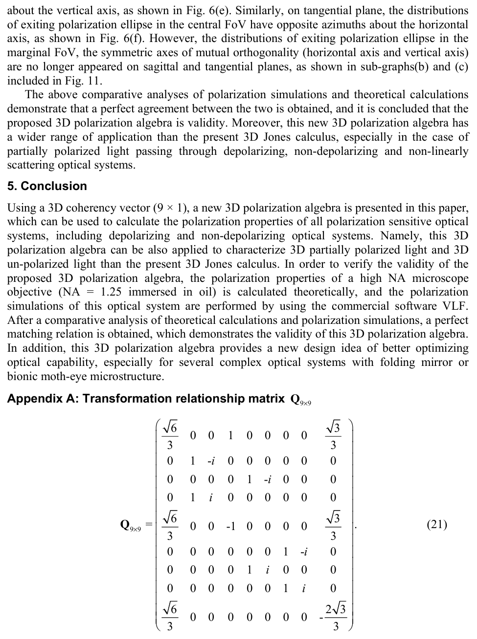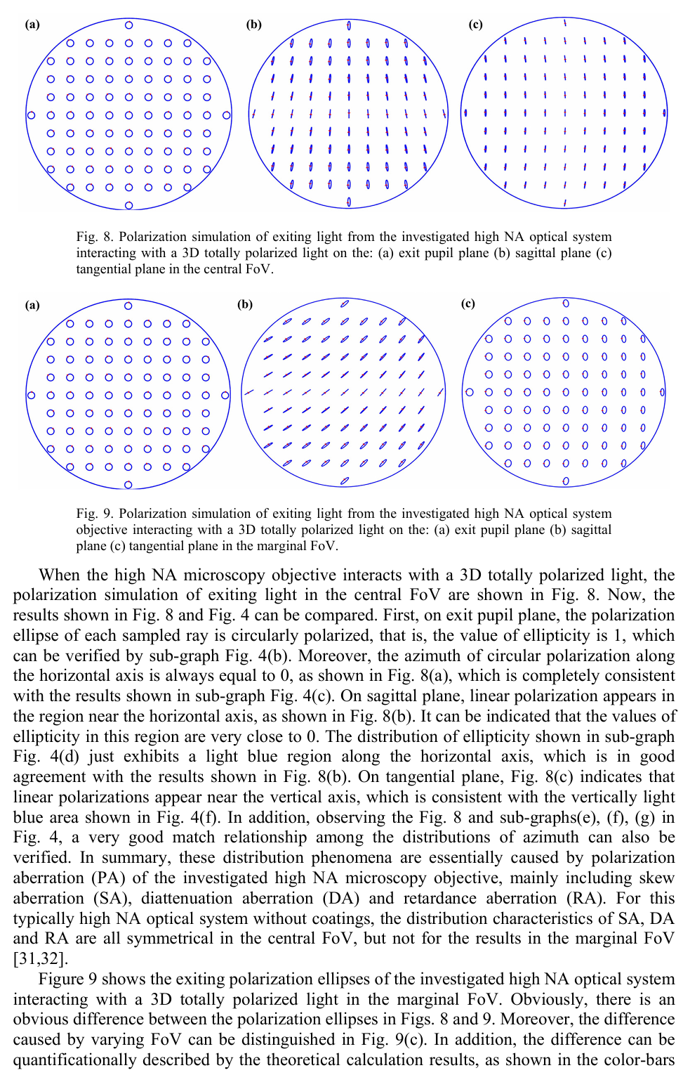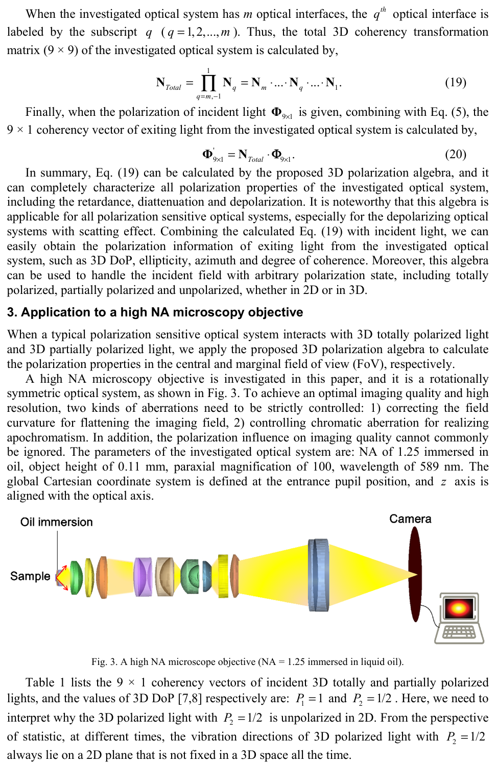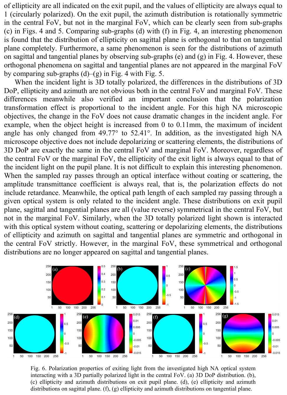 摘要:本文利用三維相干矢量(9×1矩陣)構(gòu)建了一種新型三維偏振代數(shù),可用于計(jì)算所有偏振敏感光學(xué)系統(tǒng)的偏振特性,尤其適用于入射光場(chǎng)為部分偏振或非偏振的情況;谠撊S偏振代數(shù),我們對(duì)高數(shù)值孔徑(NA=1.25油浸式)顯微物鏡的偏振特性進(jìn)行了理論分析,并采用商用軟件VirtualLab Fusion對(duì)該高數(shù)值孔徑光學(xué)系統(tǒng)進(jìn)行了偏振仿真。通過對(duì)比理論計(jì)算與仿真結(jié)果,兩者呈現(xiàn)出完全匹配的關(guān)系,證實(shí)該三維偏振代數(shù)能夠有效量化所有偏振敏感光學(xué)系統(tǒng)的三維偏振特性。