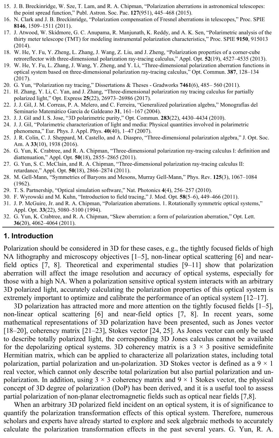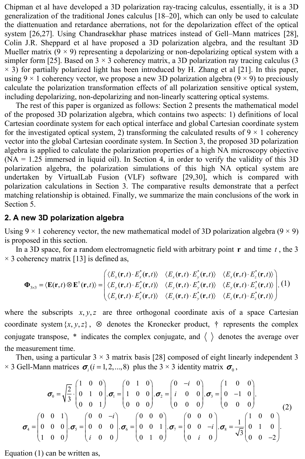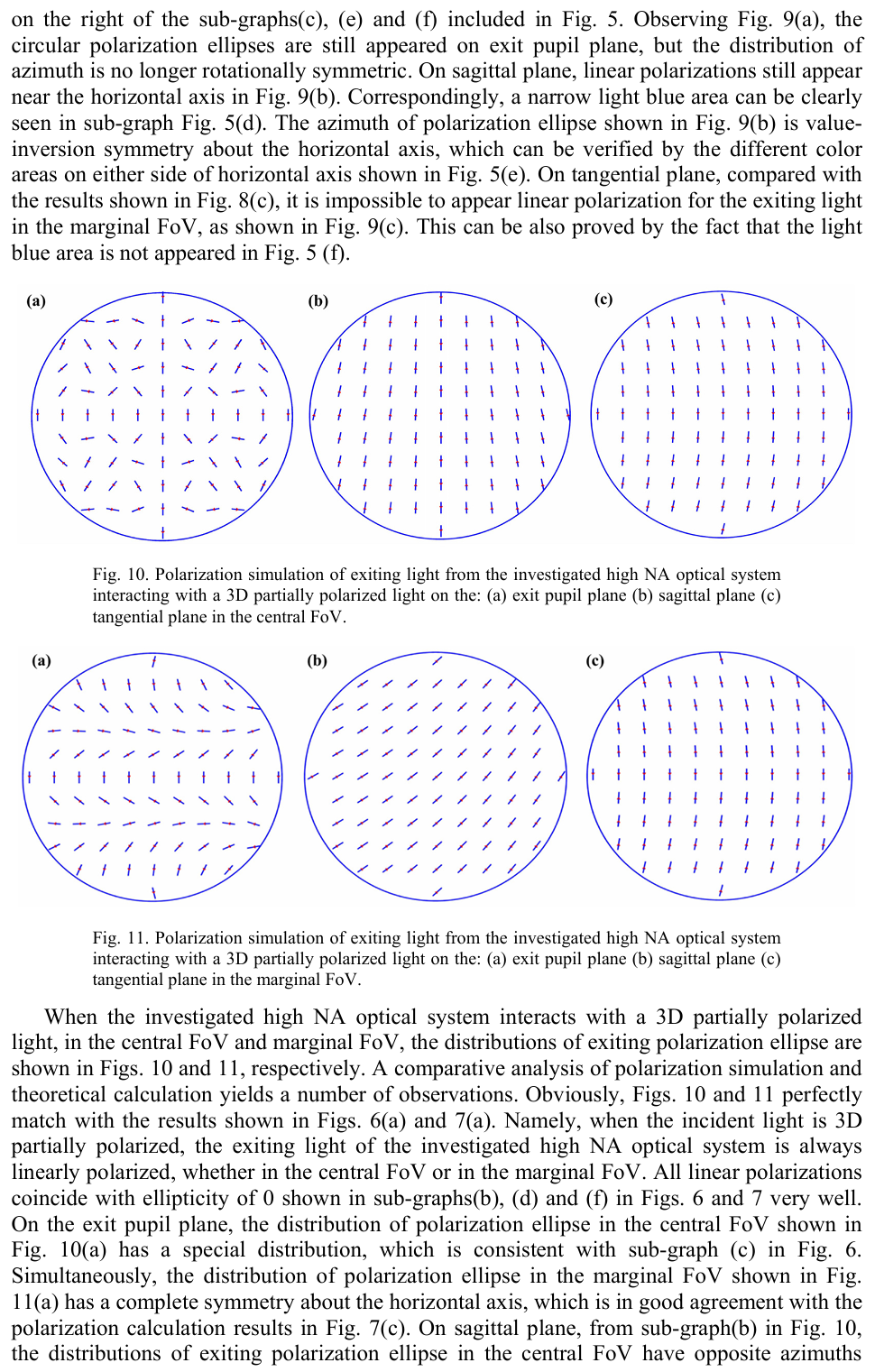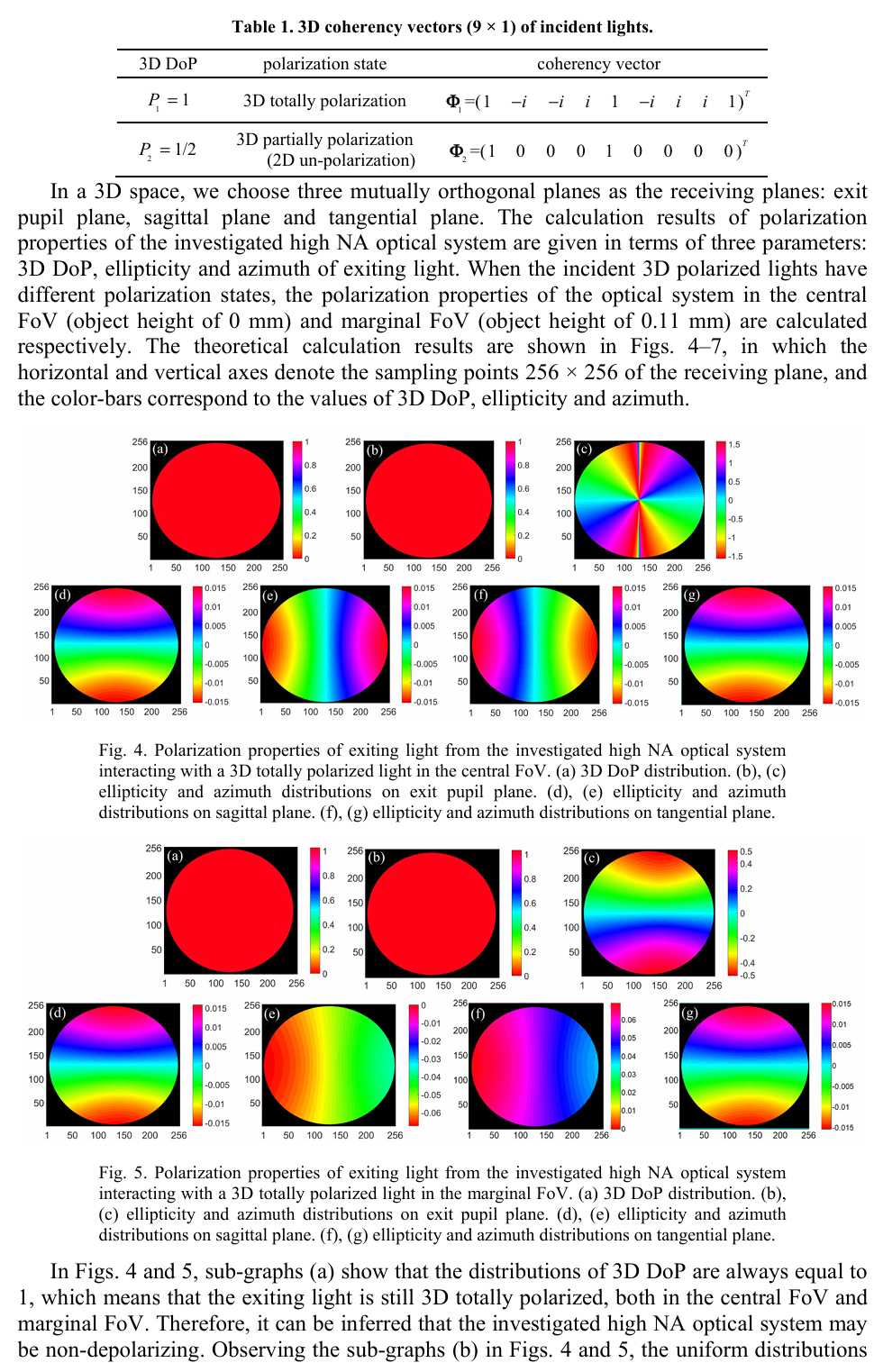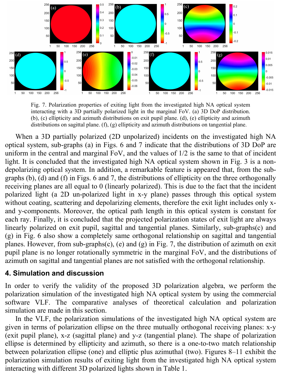 摘要:本文利用三維相干矢量(9×1矩陣)構(gòu)建了一種新型三維偏振代數(shù),可用于計(jì)算所有偏振敏感光學(xué)系統(tǒng)的偏振特性,尤其適用于入射光場(chǎng)為部分偏振或非偏振的情況;谠撊S偏振代數(shù),我們對(duì)高數(shù)值孔徑(NA=1.25油浸式)顯微物鏡的偏振特性進(jìn)行了理論分析,并采用商用軟件VirtualLab Fusion對(duì)該高數(shù)值孔徑光學(xué)系統(tǒng)進(jìn)行了偏振仿真。通過對(duì)比理論計(jì)算與仿真結(jié)果,兩者呈現(xiàn)出完全匹配的關(guān)系,證實(shí)該三維偏振代數(shù)能夠有效量化所有偏振敏感光學(xué)系統(tǒng)的三維偏振特性。